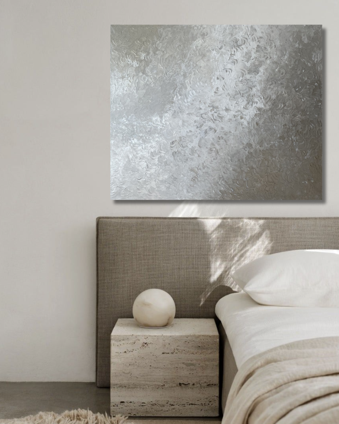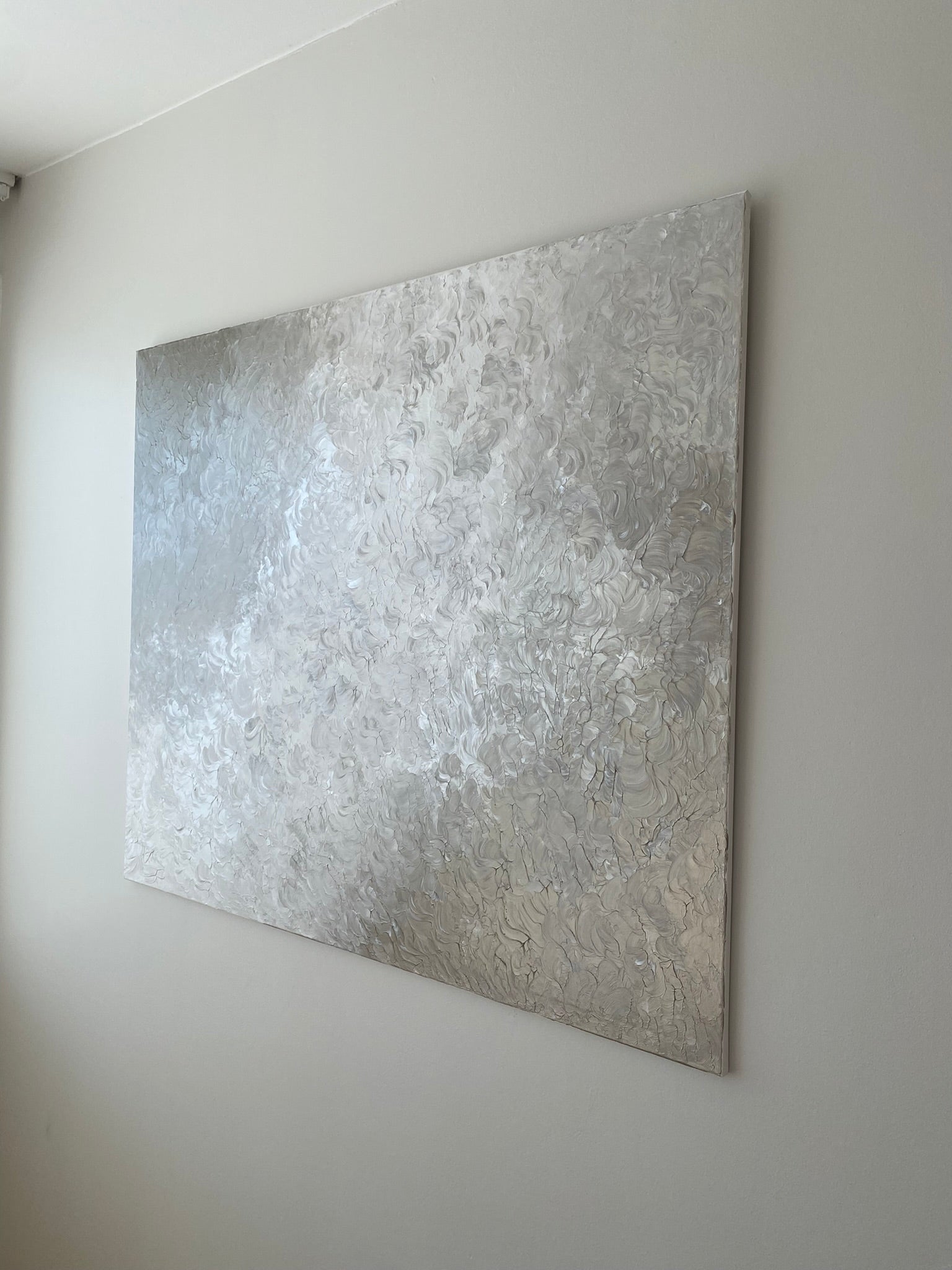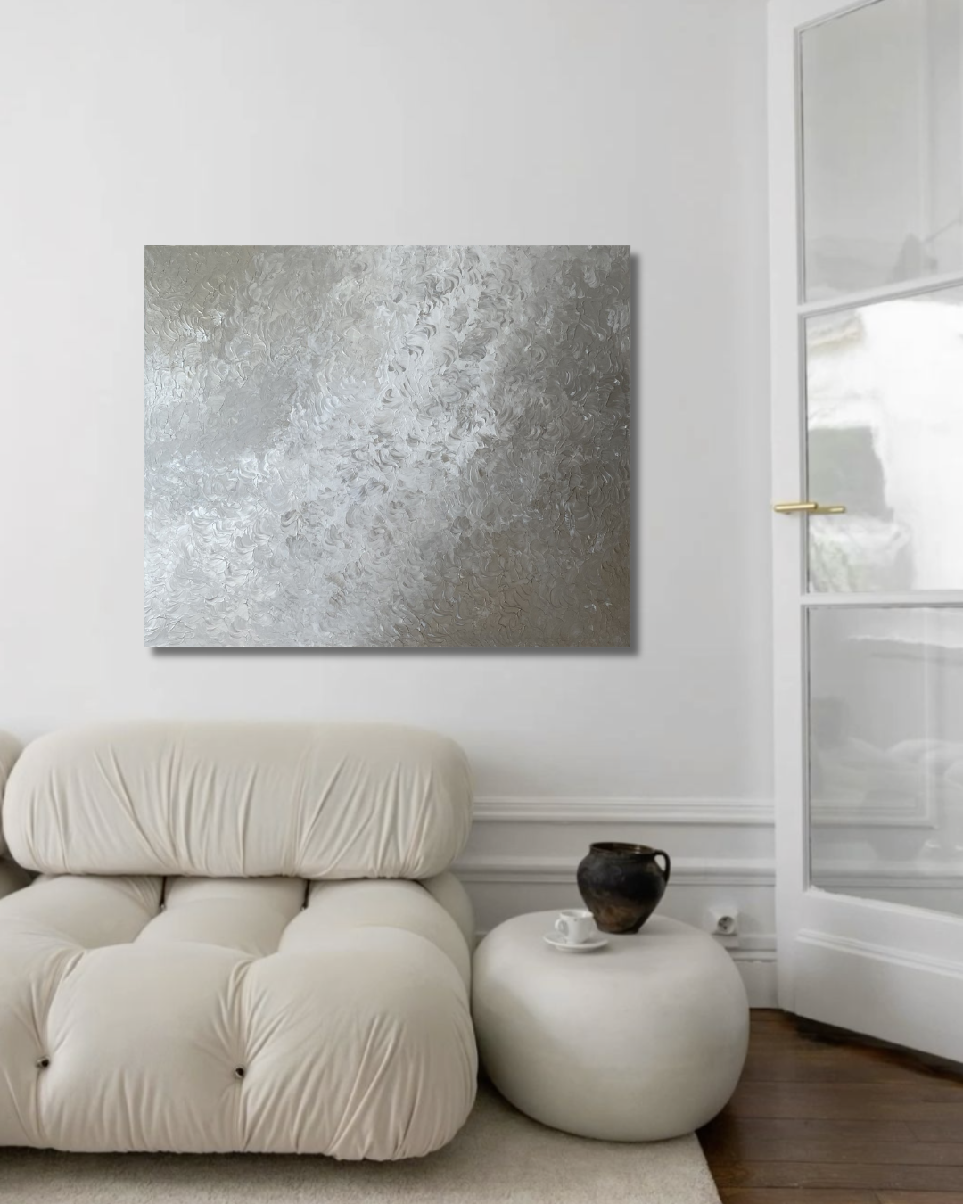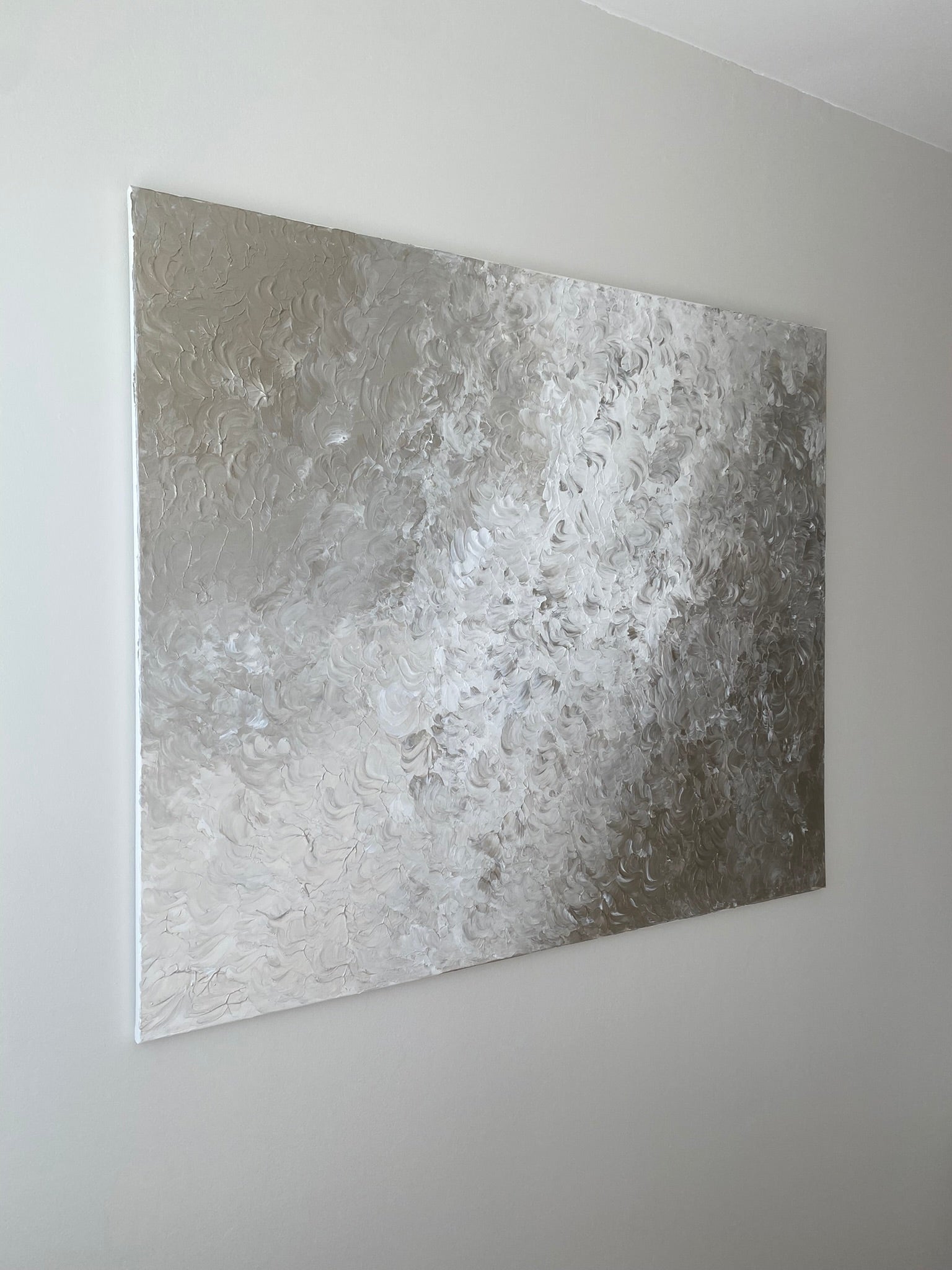 Invite calm and elegance into your space with "Glow Within", a serene abstract painting inspired by the quiet beauty of Nordic nature and minimalist design. This one-of-a-kind artwork features a harmonious blend of soft greys, whites, and subtle silver accents, evoking the natural glow of light diffused through Nordic skies.