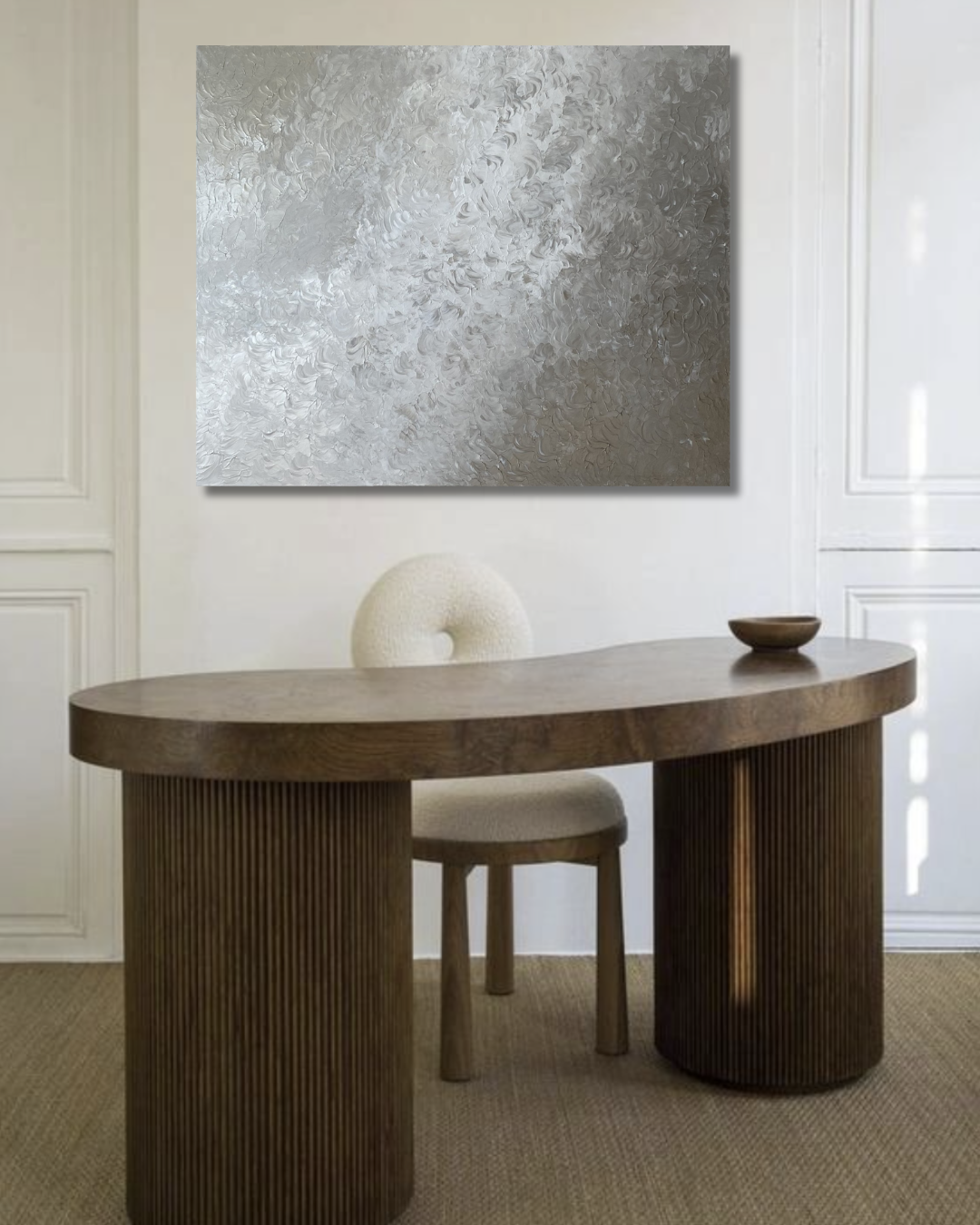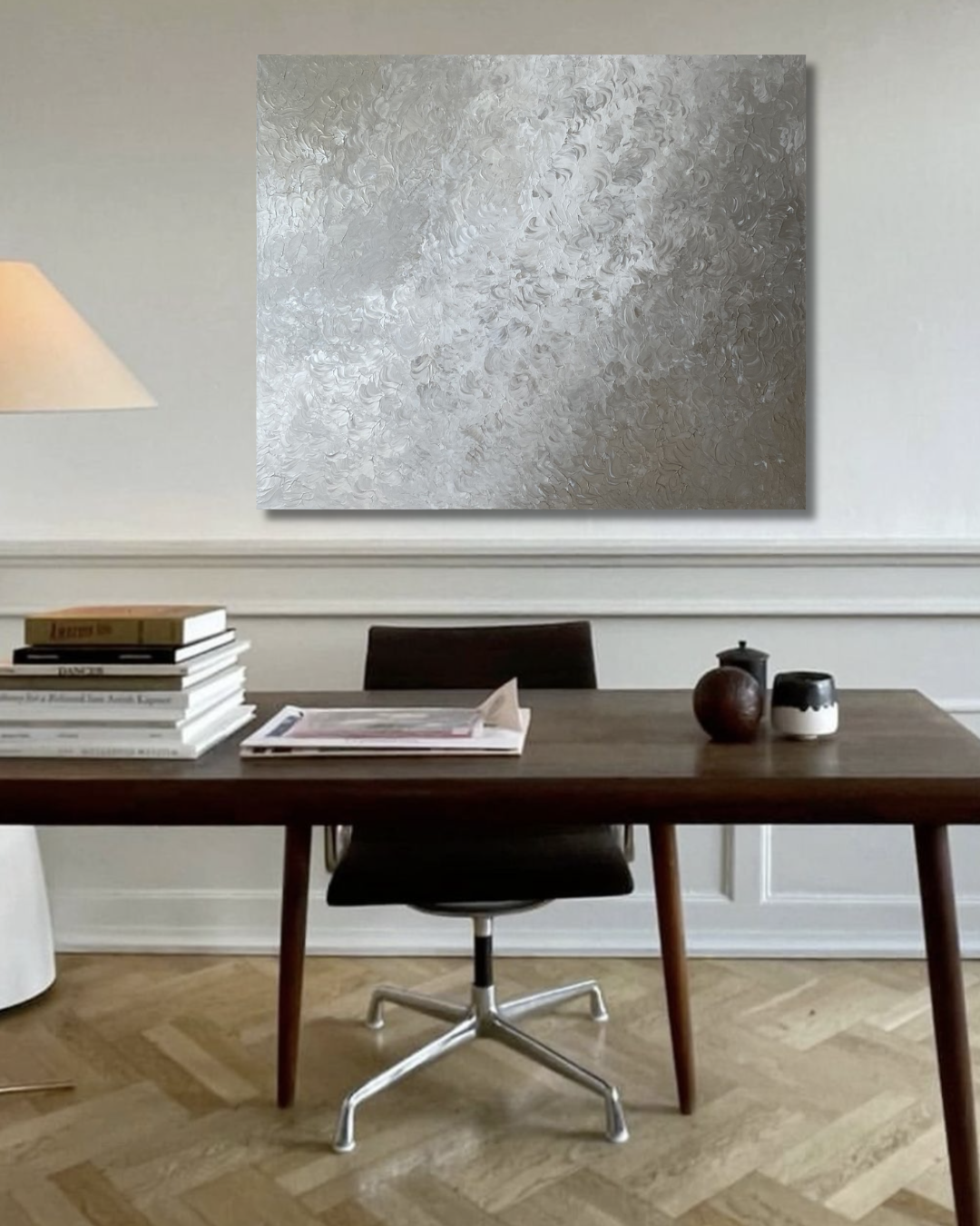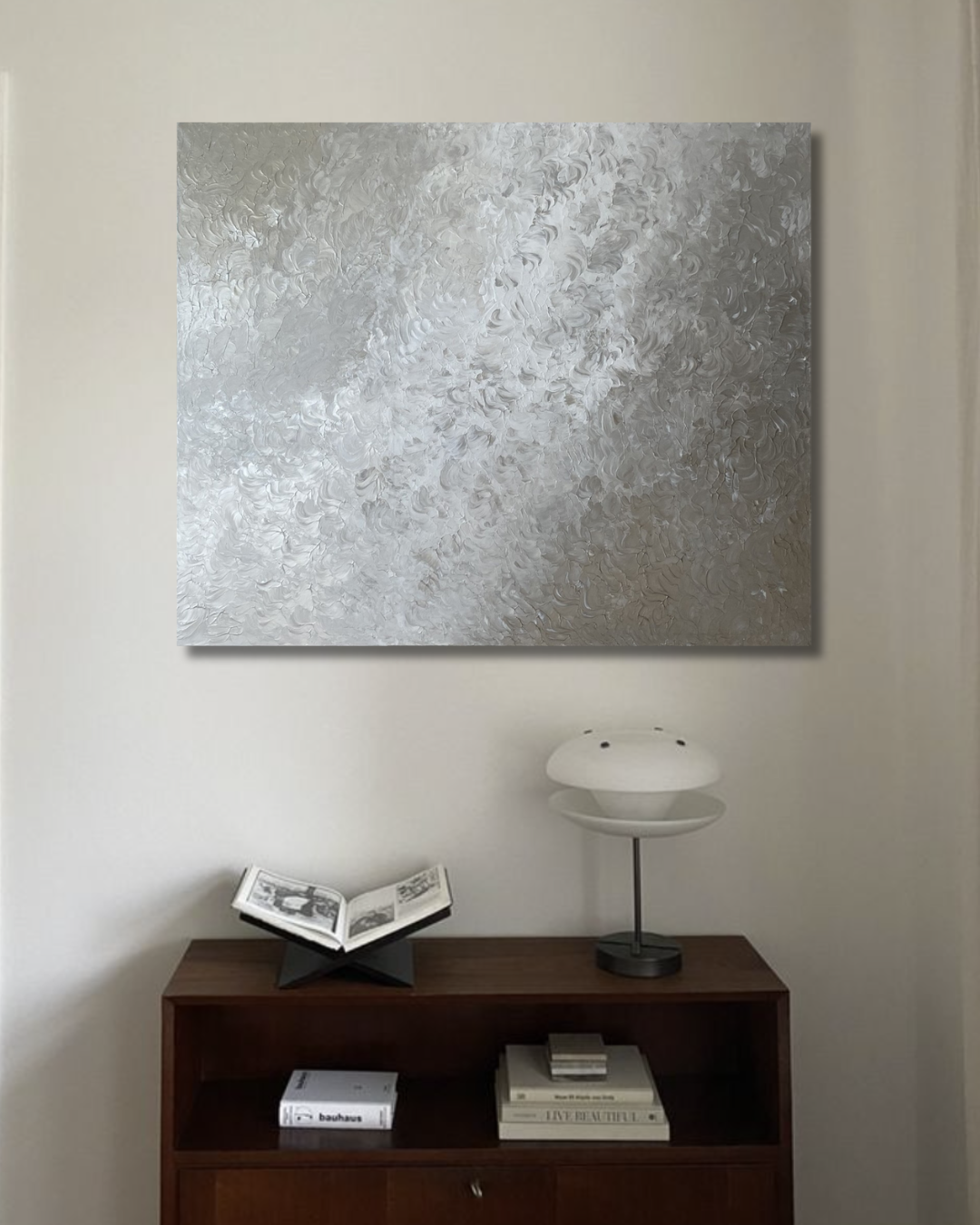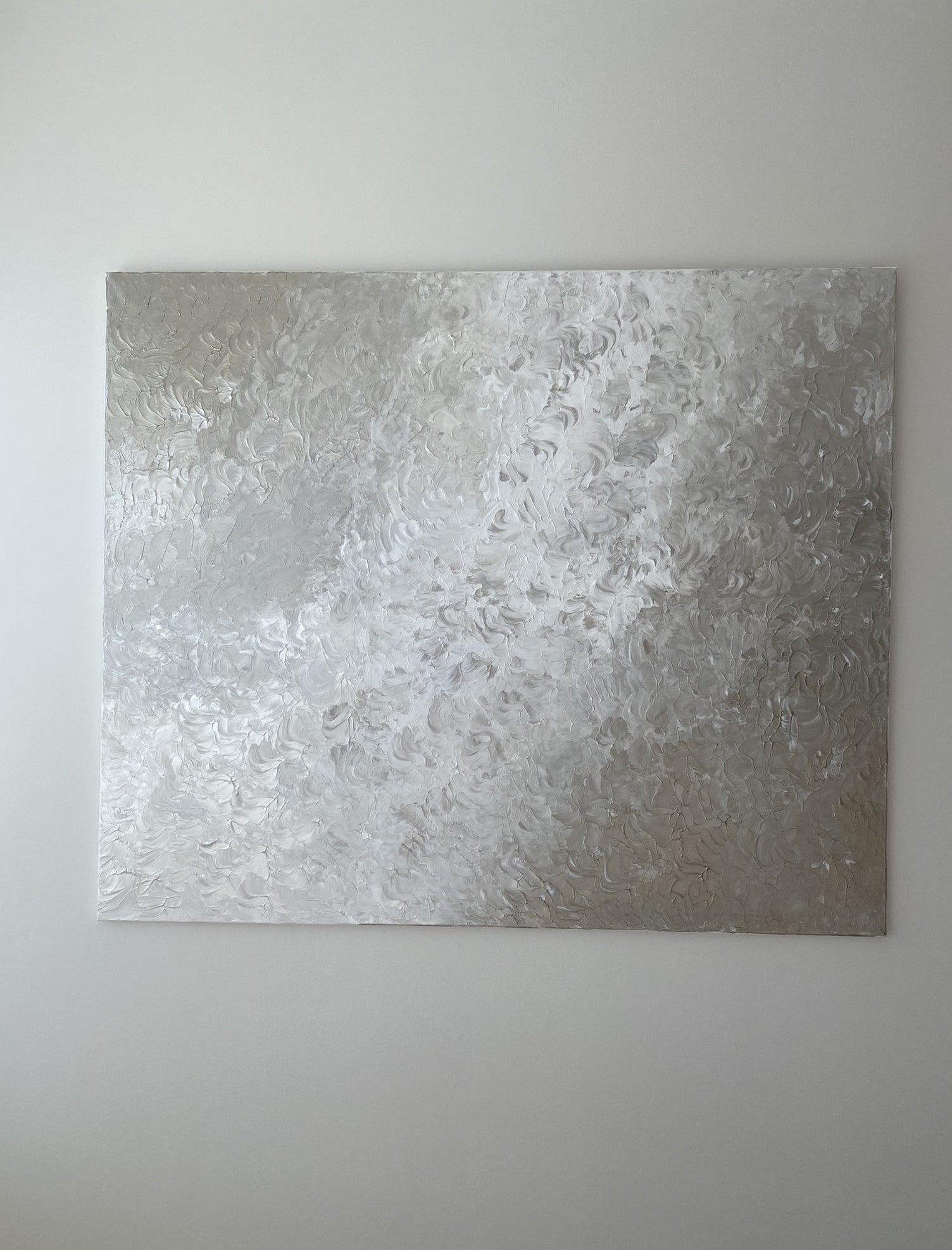 Invite calm and elegance into your space with "Glow Within", a serene abstract painting inspired by the quiet beauty of Nordic nature and minimalist design. This one-of-a-kind artwork features a harmonious blend of soft greys, whites, and subtle silver accents, evoking the natural glow of light diffused through Nordic skies.